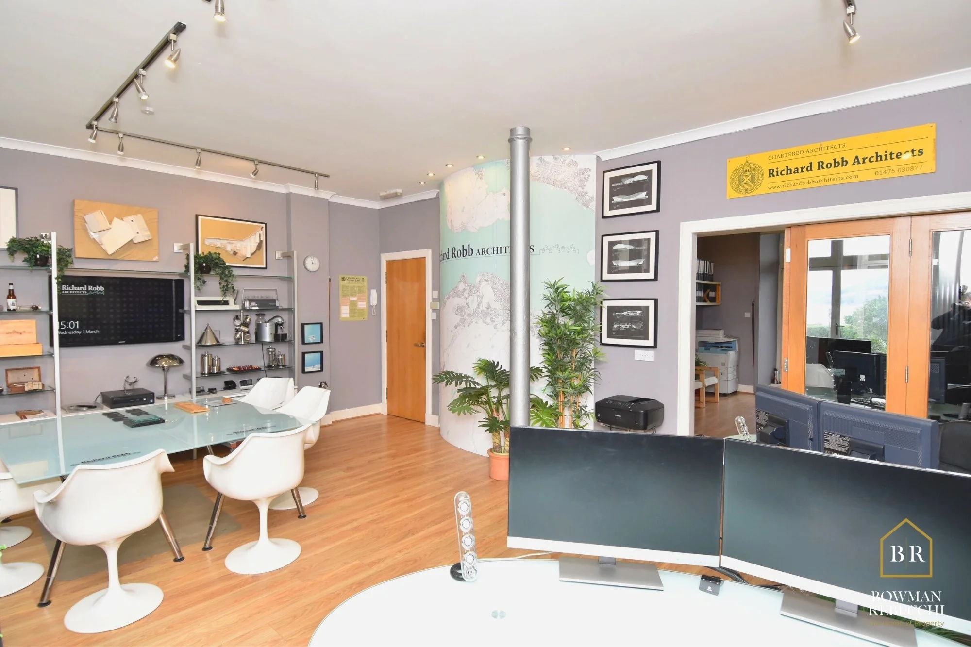 The fully furnished 710 square feet office is available to let on a long-term basis, with waterfront views, decking area, gas central heating, kitchen, private parking, and roller shutter security.